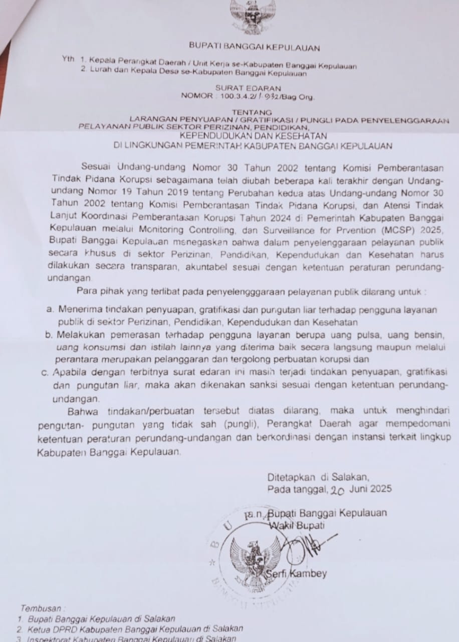 Salakan, Globalrakyat.com — Bupati Banggai Kepulauan, Rusli Moiddy, ST., MT., AIFO, resmi menerbitkan Surat Edaran Nomor: 100.3.4.2/1.932.Bag.ORG tentang Larangan Penyuapan, Gratifikasi, dan Pungutan Liar (Pungli) pada empat sektor layanan publik di lingkungan Pemerintah Kabupaten Banggai Kepulauan.