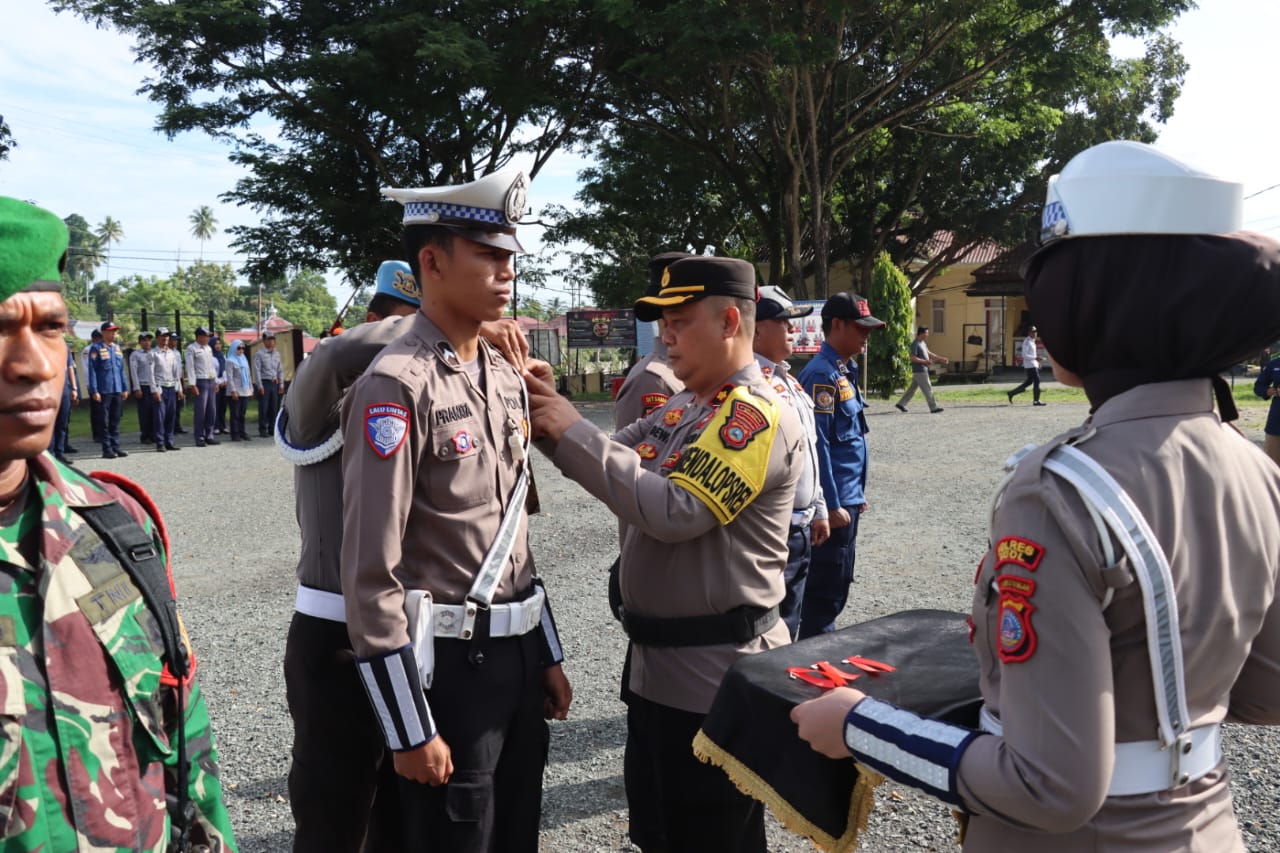 Pimpinan Apel didampingi Forkopimda pada apel gelar ini mengecek pasukan peserta apel selanjutnya memasang pita tanda operasi kepada perwakilan peserta apel, dan juga menyampaikan amanat Kapolri Jenderal Polisi Drs. Listyo Sigit Prabowo, M.Si. yang mengucapkan terimakasih kepada undangan yang hadir serta peserta apel.