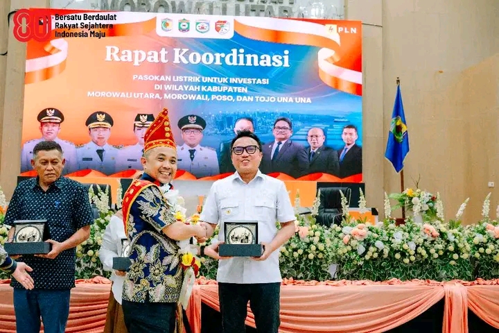 Syukuran yang dirangkaikan dengan rapat kordinasi pasokan listrik untuk industri berlangsung di Ruang Pola Kantor Bupati Morut di Kolonodale, Sabtu (9/8/2025).