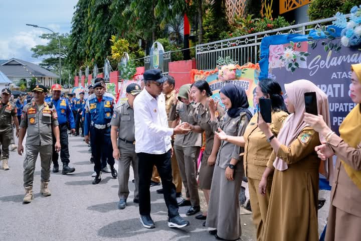 Diawali pengalungan bunga yang dilakukan langsung oleh Sekretaris Daerah Ir. Musda Guntur, MM, pasangan bupati dan Wabup kemudian mengalami semua pejabat dan pegawai yang berdiri di teras kantor bupati.
