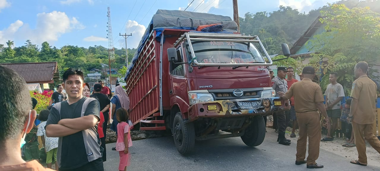 Liang, Globalrakyat.com – Telah Terjadi Laka Lantas Tunggal yang Mengakibatkan Mobil Truk Warna merah DM 8039 BH mengalami kerusakan Pada Propeler sap