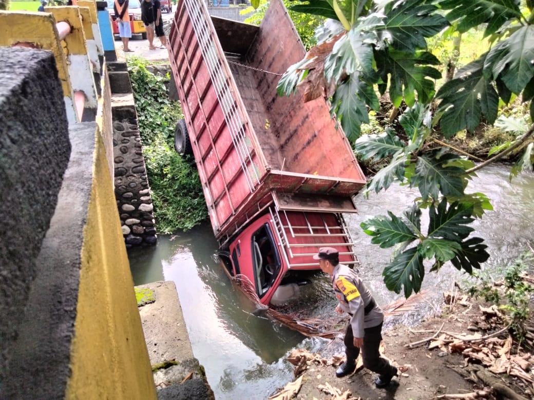 Truk tanpa muatan tersebut berusaha menghindari kendaraan yang berhenti tepat didepannya, hingga hilang kendali dan terperosok hingga masuk ke sungai.