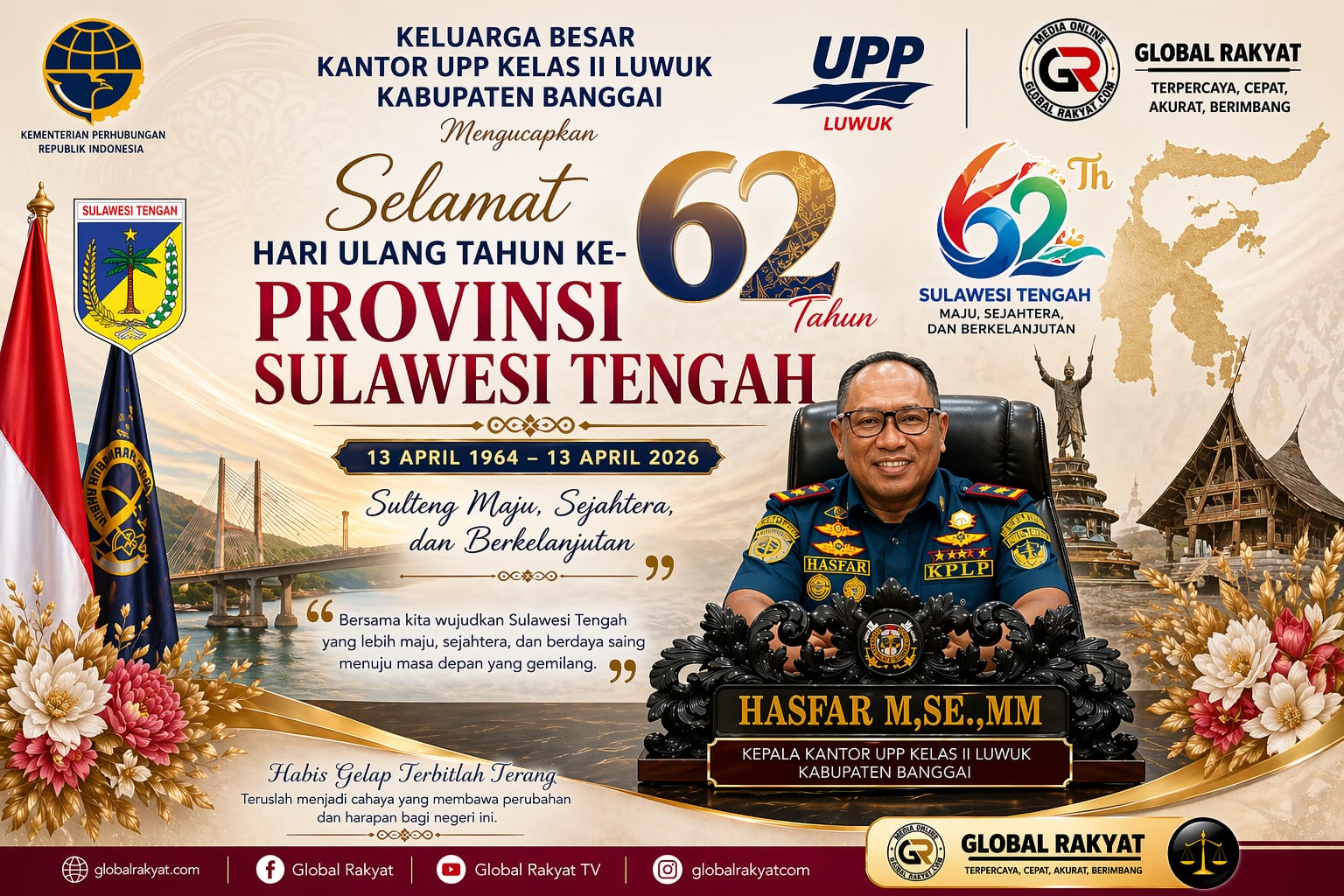 HUT Ke-62 Tahun Provinsi Sulawesi Tengah Admin Global RakyatApril 22, 20268 Views Post Views: 8 Baca Juga Berita Ini: Marhaban Ya Ramadhan Related postsSelamat Hari Kartini 21 April 2026Selamat Hari Kartini 21 April 2026Selamat Hari Kartini 21 April 2026Sita 37 Paket Sabu Seberat 30,14 Gram, Polisi Amankan Pengedar Di Kota LuwukDirektur Rumah Sakit Umum Daerah Luwuk, Kabupaten Banggai, Mengucapkan Dirgahayu Provinsi Sulawesi Tengah Yang Ke 62 TahunJangan Anggap Remeh! Diabetes Bisa Picu Stroke Dan Jantung