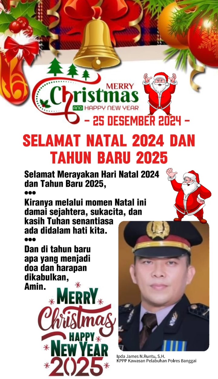 Ipda James N.Runtu, S.H KPPP Kawasan Pelabuhan Polres Banggai Mengucapkan Selamat Natal 2024 Dan Tahun Baru 2025 Admin Global RakyatDecember 24, 2024103 Views Post Views: 103 Baca Juga Berita Ini: SELAMAT TAHUN BARU 2025 Related postsPolsek Toili Amankan Pelaku Pencurian yang Resahkan WargaSELAMAT TAHUN BARU 2025SELAMAT TAHUN BARU 2025SELAMAT TAHUN BARU 2025SELAMAT TAHUN BARU 2025Polsek Batui, Damaikan Mertua dan Menantu yang Berselisih