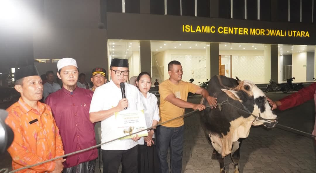Sapi kurban yang diterima, langsung diserahkan oleh Bupati Delis yang didampingi oleh Ketua TP-PKK Morut Ny. Febriyanthi H.D.J. Hehi, S.Si, Apt kepada pengurus Masjid Islamic Center di Kota Kolonodale pada Kamis malam, (5/06/2025).
