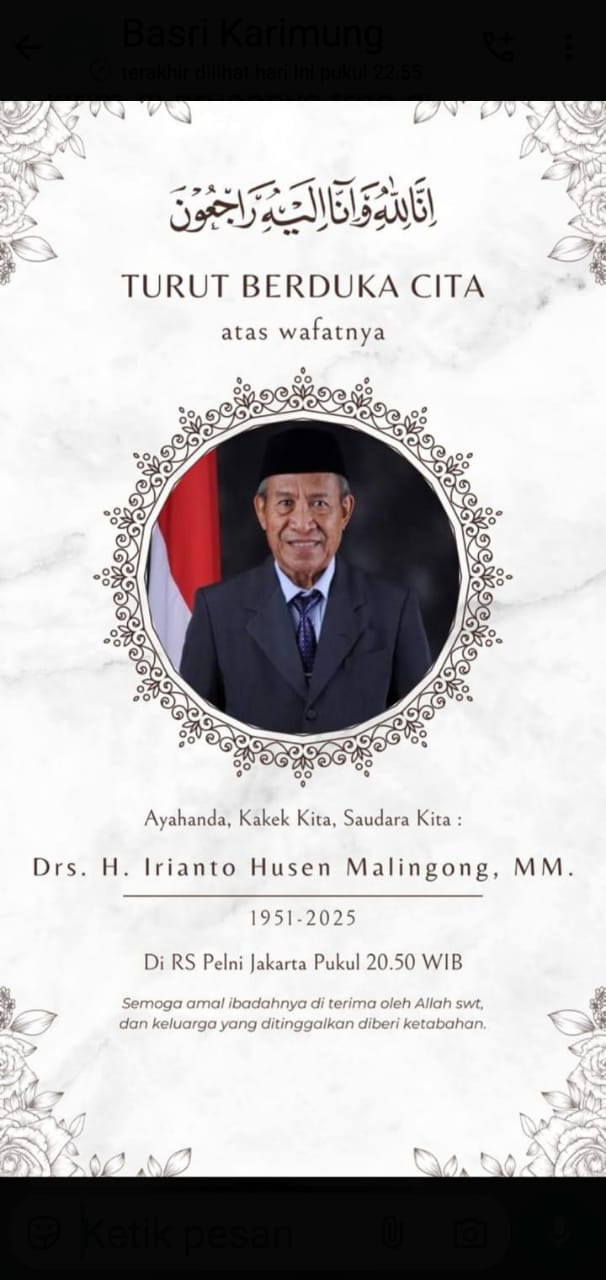 “Innalillahi wa inna ilaihi raji’un… Telah berpulang ke rahmatullah Kakak, Ayahanda, Kakek kita: H. IRIANTO HUSEN MALINGONG, malam ini 15 Juni 2025 pukul 20.50 WIB, di RS Pelni Jakarta. Mohon dimaafkan seluruh salah dan khilafnya.”