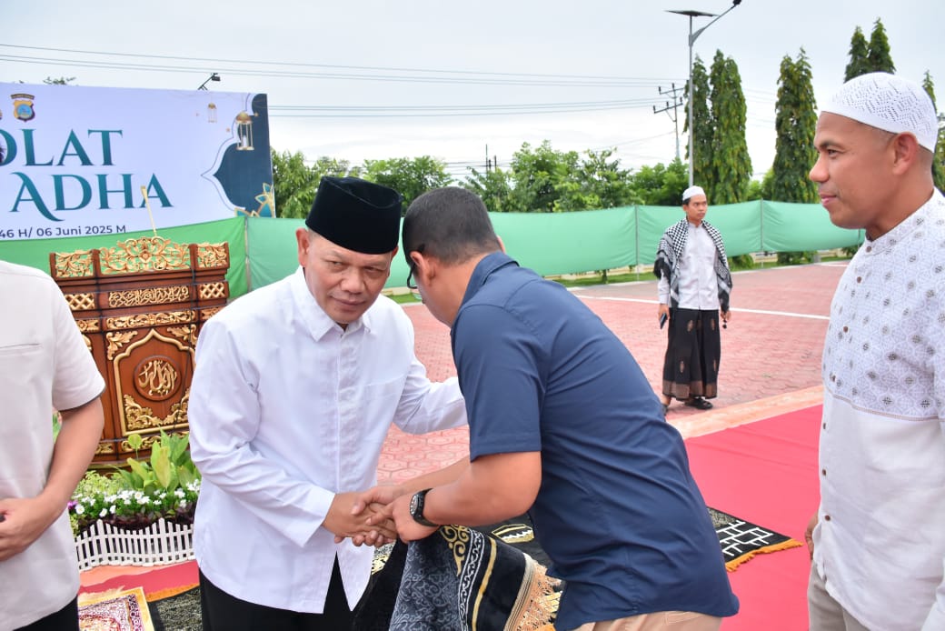 Usai Sholat, Kapolda Sulteng bersalaman dengan masyarakat dan personel dalam momen halalbihalal. Suasana hangat dan akrab terasa saat warga saling bertukar ucapan selamat Idul Adha di tengah suasana penuh kekeluargaan.
