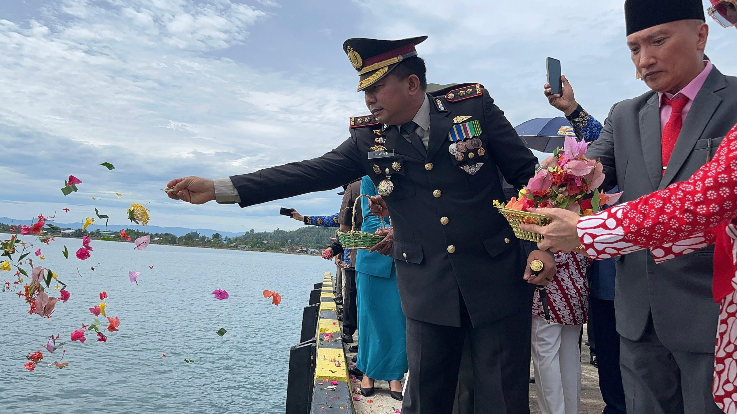Setelah upacara resmi dinyatakan selesai, rombongan Forkopimda dan tamu undangan melanjutkan kegiatan dengan Penaburan Bunga secara langsung di sekitar Dermaga Pelabuhan Leok.