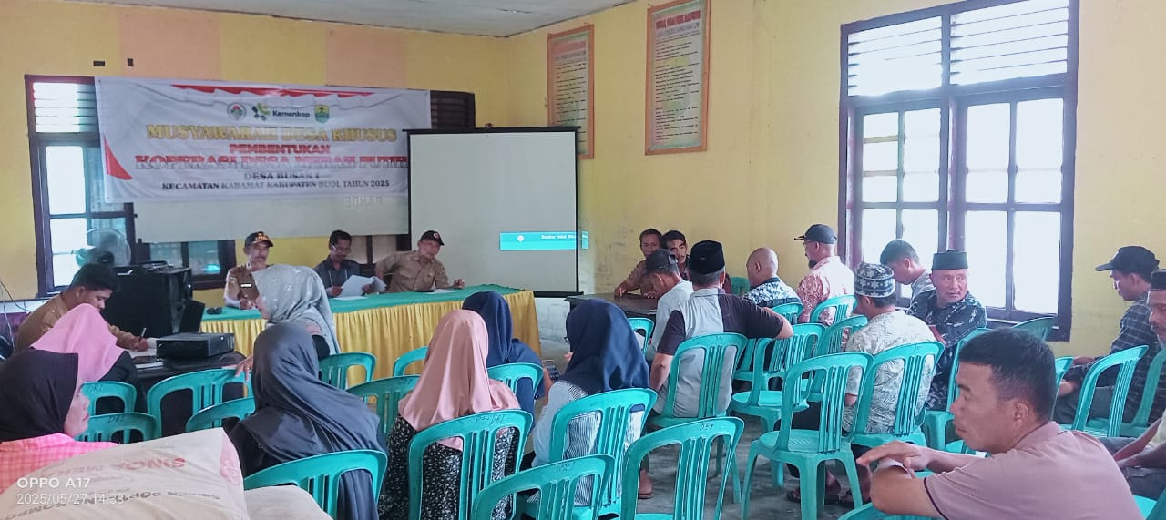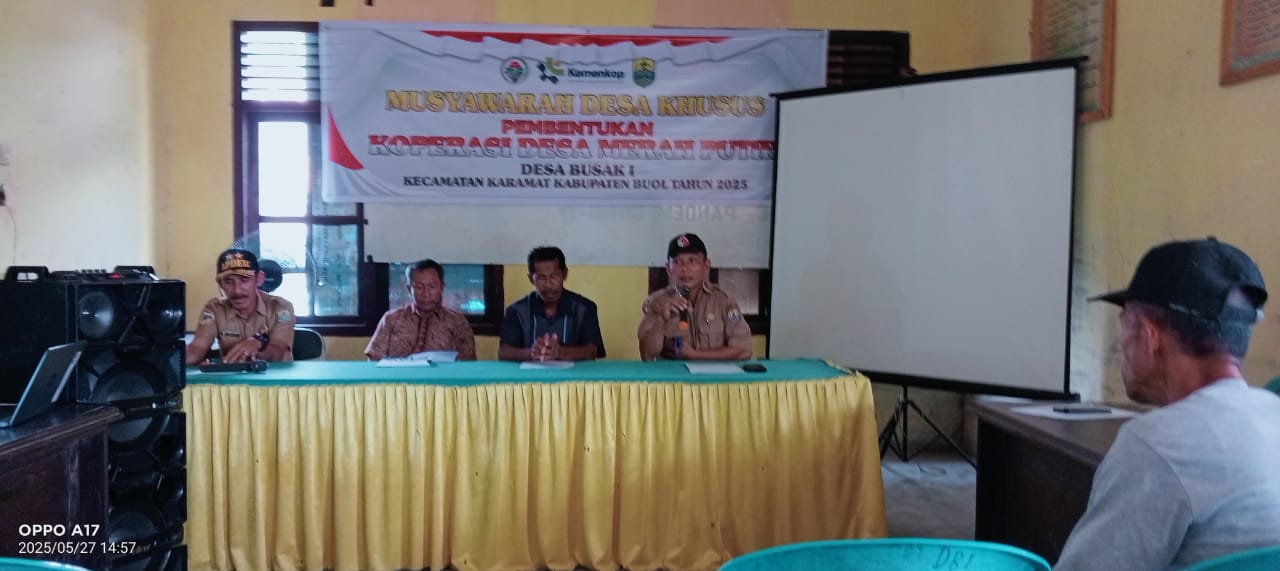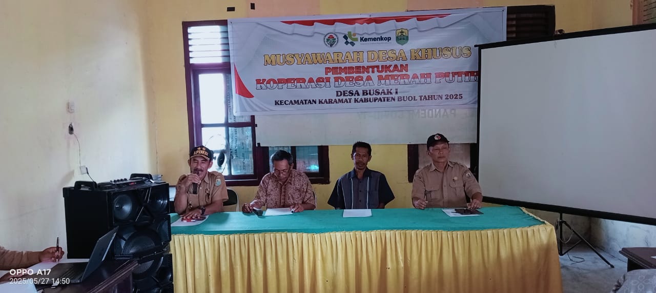 Kepala Desa Busak 1, Umar Moh. Yamin Batalipu, S.IP, menggelar musyawarah bersama warga dan tokoh masyarakat dalam rangka pembentukan Koperasi “Desa Merah Putih”. Selasa 28 Mei 2025.