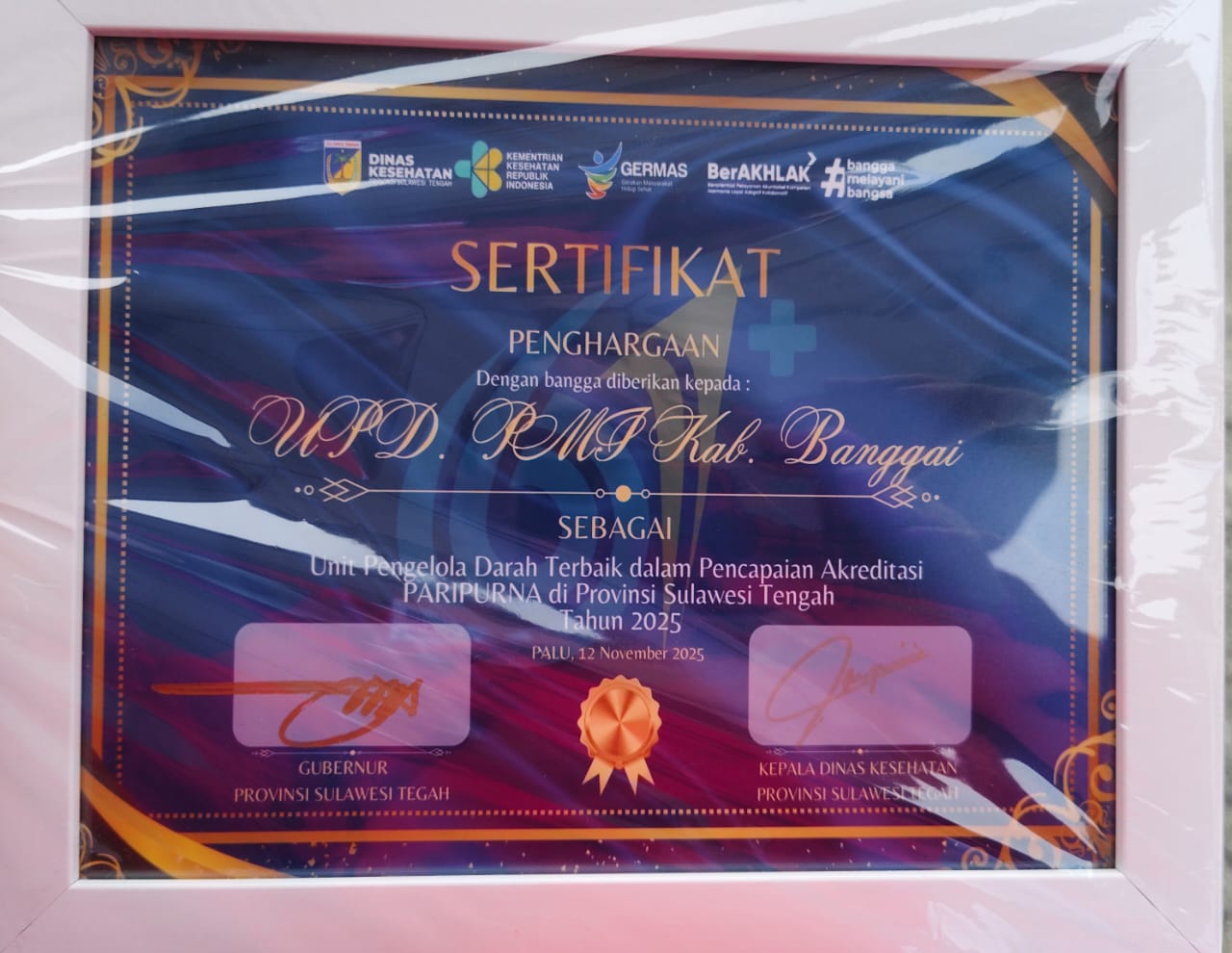 Palu, Globalrakyat.com – Kepala Unit Transfusi Darah (UTD) Luwuk, Kabupaten Banggai, dr. NHD Gunawan, M.Kes, menerima penghargaan Pengelola Darah Terbaik (PDT) atas pencapaian akreditasi paripurna di Provinsi Sulawesi Tengah. Penyerahan penghargaan berlangsung di halaman Kantor Dinas Kesehatan Provinsi Sulawesi Tengah, Kota Palu, Rabu (12/11/2025).