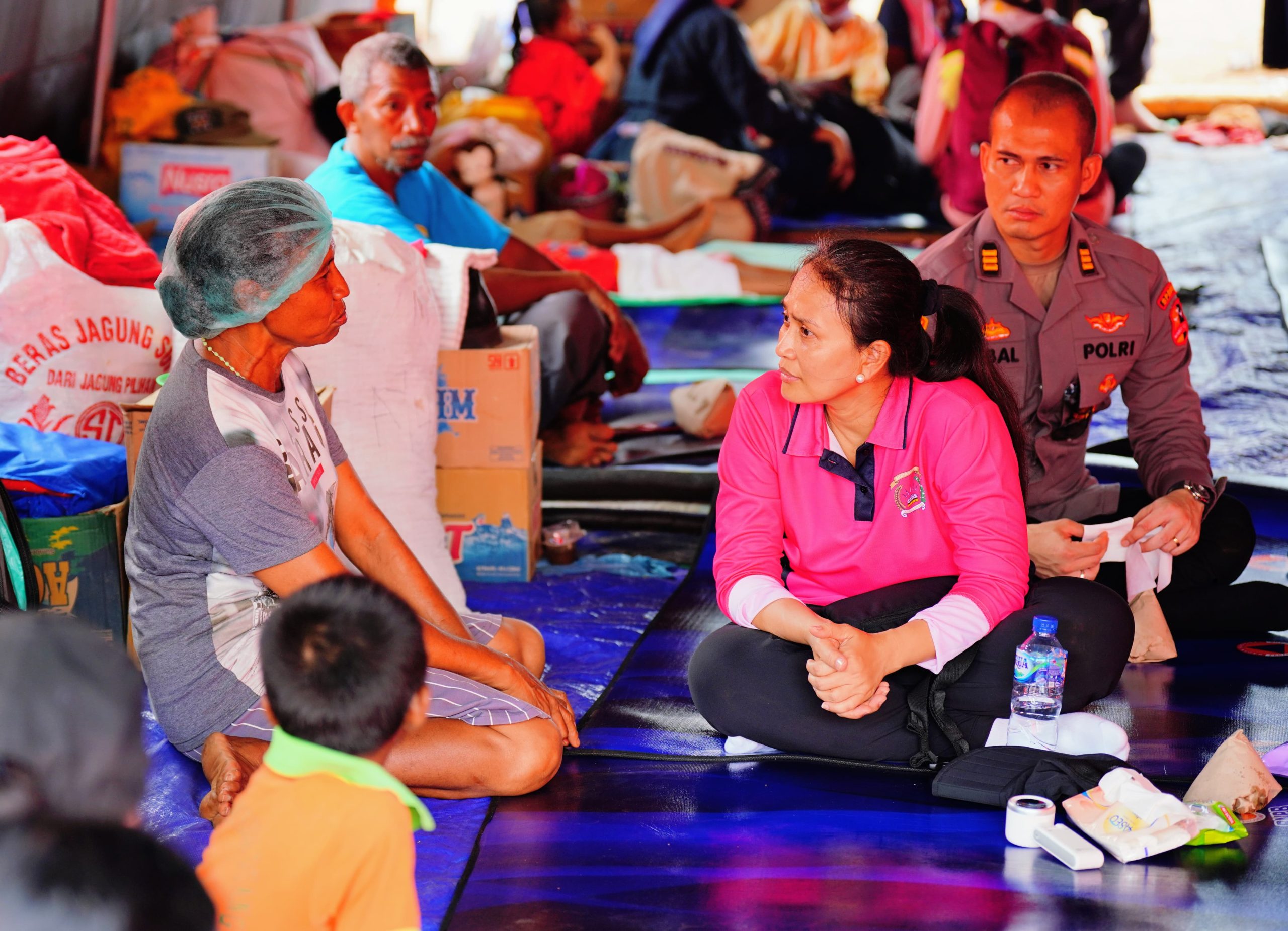 Ketum Bhayangkari juga menampung keluhan dari pengungsi terkait air yang masuk ke tenda saat hujan kemarin. Selain itu, ia bermain dengan anak-anak yang ada di tenda pengungsian hingga makan siang bersama para pengungsi.