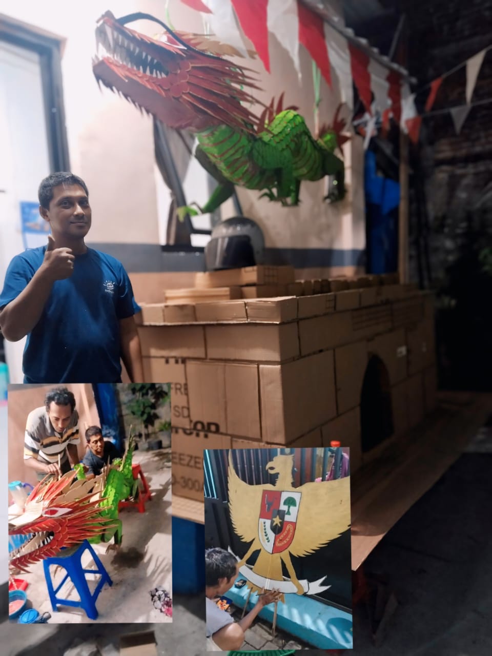 Salah satu yang mencuri perhatian adalah karya kreatif Muhari, warga ARDO ’93, yang membuat replika naga dan candi dari bahan kardus bekas. Karya ini dikerjakan secara mandiri dengan detail yang memukau, mengusung tema Kampung Cina dan Kerajaan Nusantara.