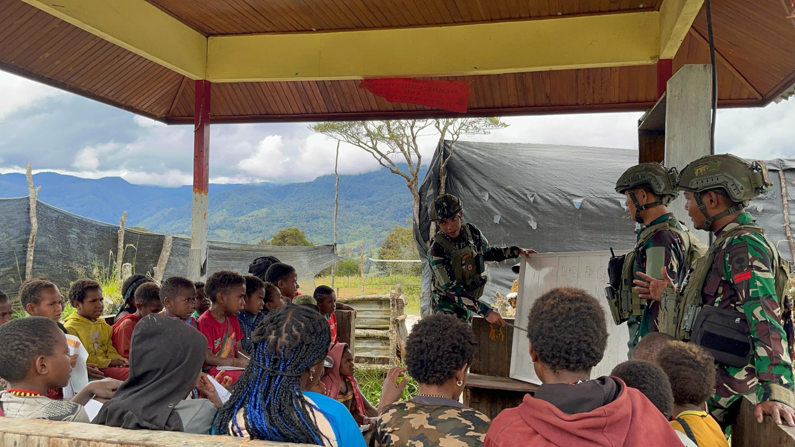 Kegiatan belajar di Pos Eromaga ini bukan sekadar rutinitas—ia adalah denyut harapan di tengah terpencilnya akses. Dalam dekapan alam Pegunungan Papua yang megah, para prajurit dengan rompi dan helm tetap, mengajar dengan hati, menyambung harapan dari generasi ke generasi.