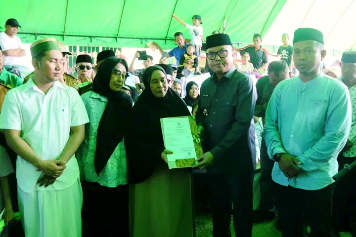 Setelah upacara pelepasan berakhir, Bupati Delis dan Ketua TP-PKK Morut Ny. Febriyanthi menyerahkan santunan dari pengurus Korpri dan TP-PKK Morut dilanjutkan dengan penyerahan akta kematian dari Disdukcapil Morut.