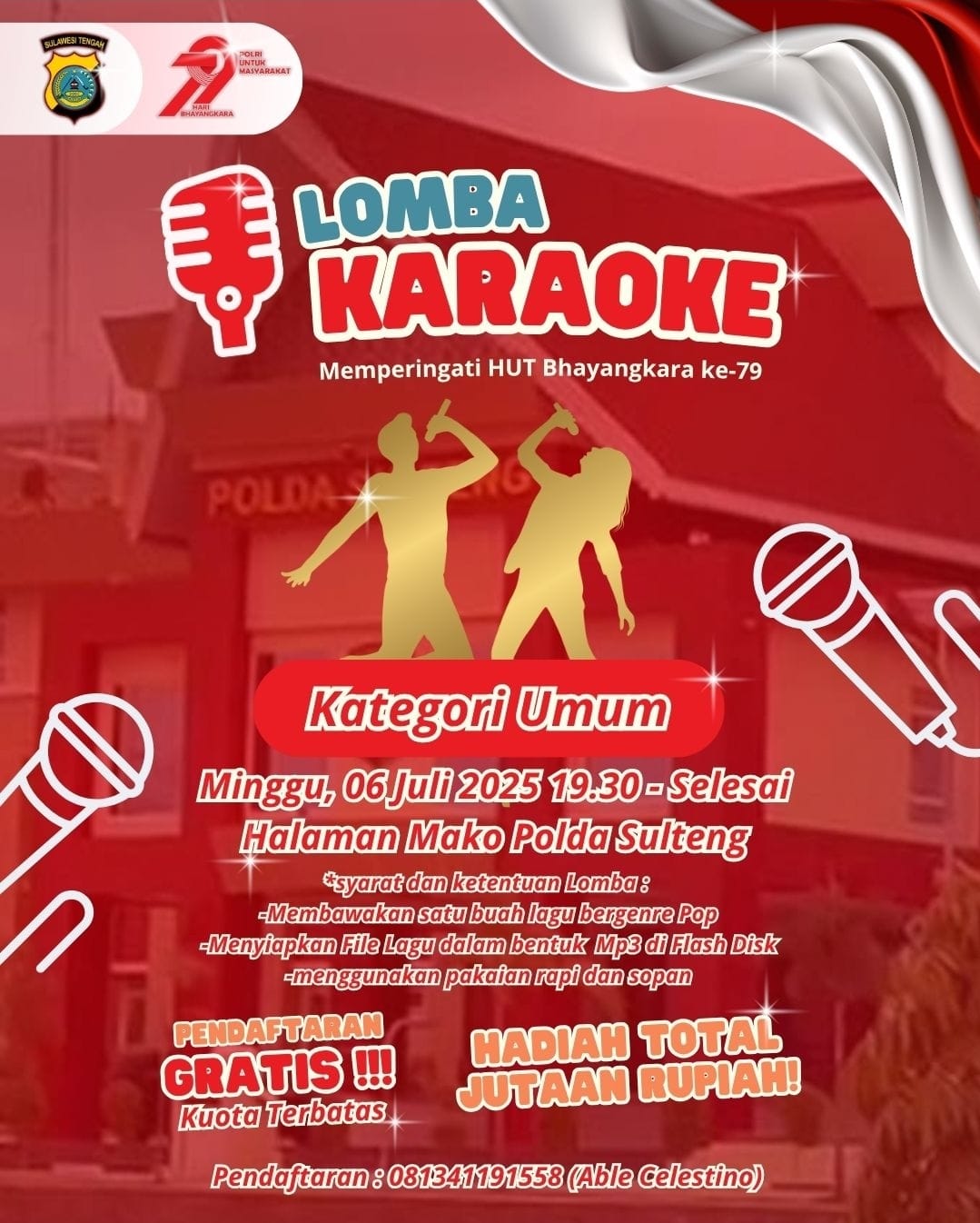Palu, Globalrakyat.com – Dalam rangka menyemarakkan Hari Ulang Tahun (HUT) Bhayangkara ke-79 dengan tema “Polri Untuk Masyarakat”, Kepolisian Daerah Sulawesi Tengah (Polda Sulteng) akan menggelar Lomba Karaoke “Semarak Bhayangkara”. Kegiatan ini terbuka untuk umum dan diselenggarakan berlangsung pada Minggu, 6 Juli 2025, mulai pukul 20.00 WITA, bertempat di Halaman Mako Polda Sulteng.