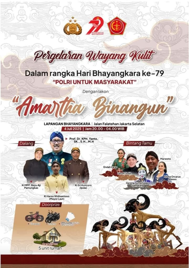 Palu, Globalrakyat.com –  Kepolisian Negara Republik Indonesia (Polri) secara serentak akan menggelar nonton bareng (Nobar) pagelaran wayang kulit dengan lakon “Amartha Binangun” yang dipusatkan di Lapangan Bhayangkara Jalan Falatehan Jakarta Selatan, Jumat (4/7/2025) Pukul 20.00 Wita.