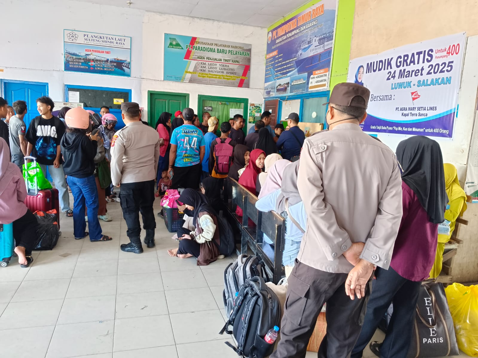 Banggai, Globalrakyat.com – Polres Banggai melalui Polsubsektor Pelabuhan Luwuk yang dipimpin oleh Kepala Polsubsektor IPDA James Runtu, melakukan pengamanan terhadap arus mudik gratis penumpang, di Pelabuhan Rakyat Luwuk, Senin (24/3/2025).