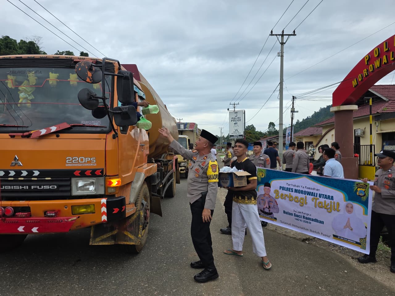 Kegiatan yang berlangsung pada Rabu, 25 Februari 2026 sore ini, Polres Morowali Utara bagikan Takjil gratis sebanyak 200 bungkus takjil dengan menyasar para pengendara roda dua, roda empat, roda enam hingga warga sekitar yang sedang melintas menjelang waktu berbuka puasa.
