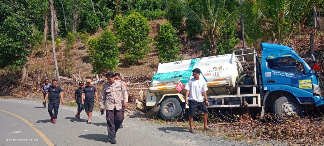 Banggai, Globalrakyat.com – Satu unit truk tangki pengangkut BBM milik PT. Adiguna Bumi Patrol mengalami rem blong dan masuk ke saluran air di Jalan Trans Sulawesi Desa Tuntung Kecamatan Bunta, Banggai, Sabtu (31/5/2025).