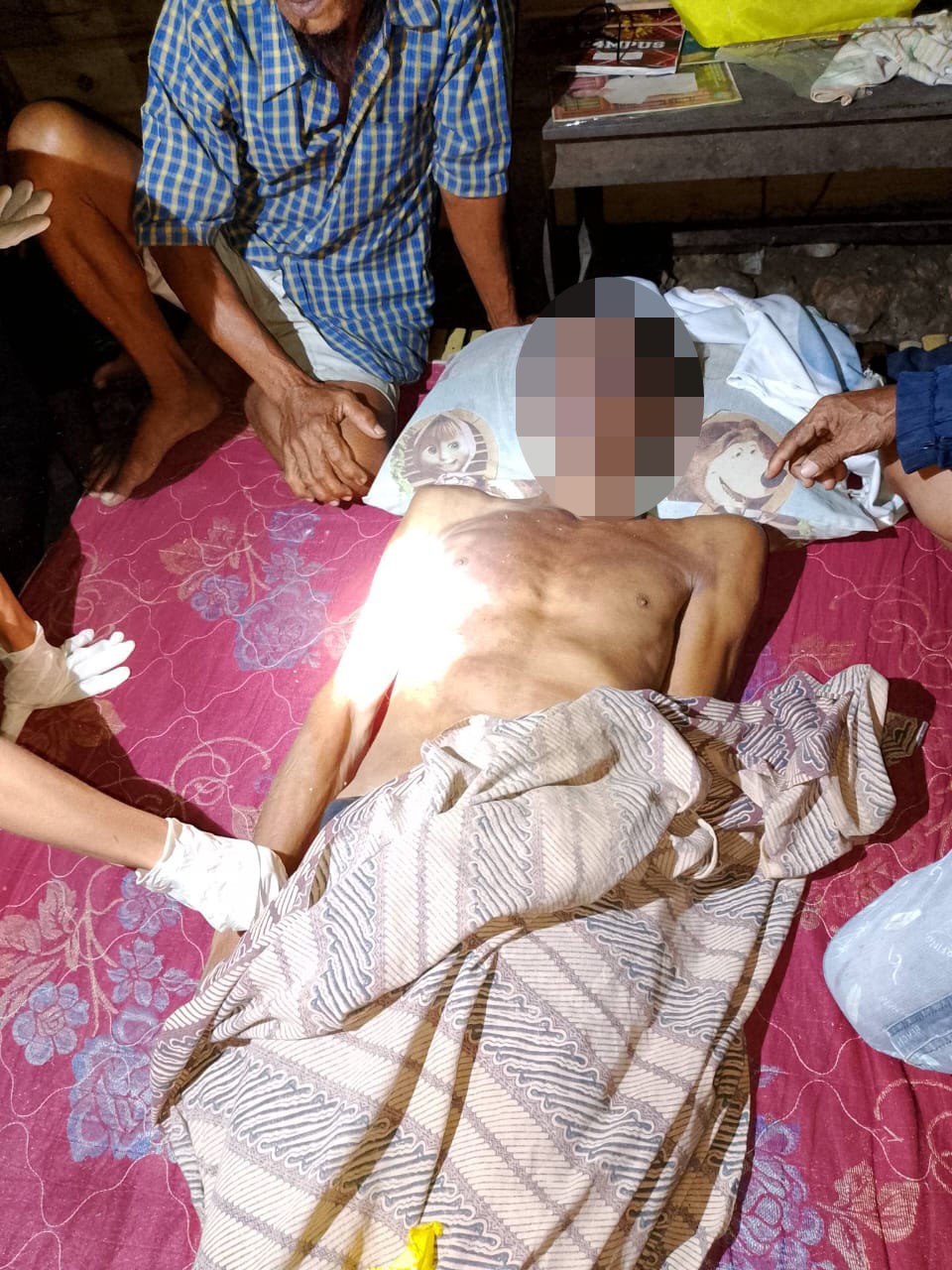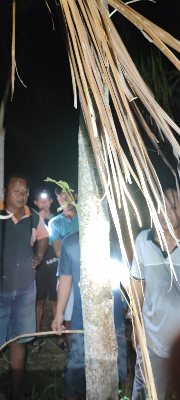 Posisi korban tertelungkup, tali yang menjerat leher korban telah putus karena terbuat dari anyaman daun kelapa.