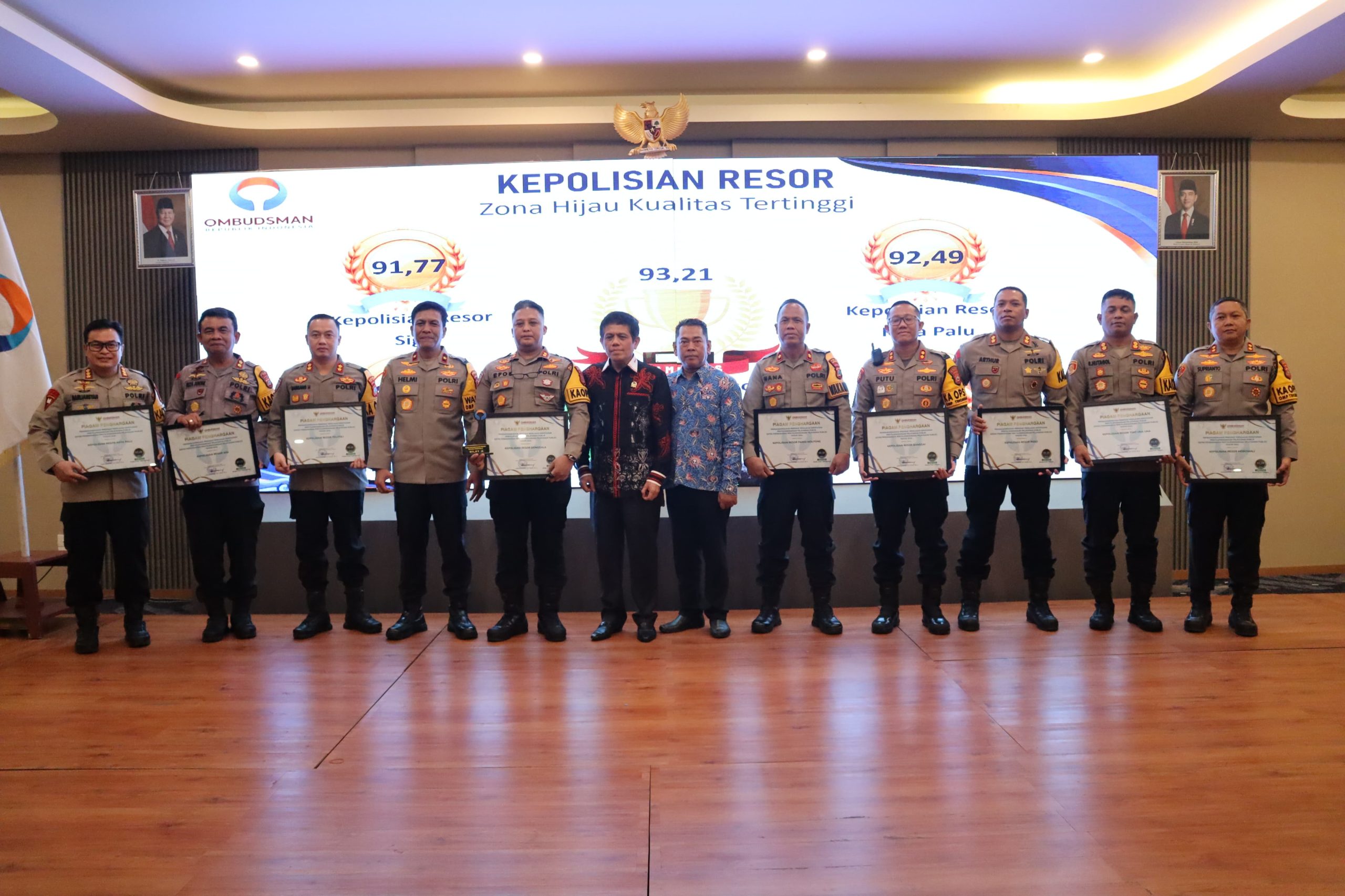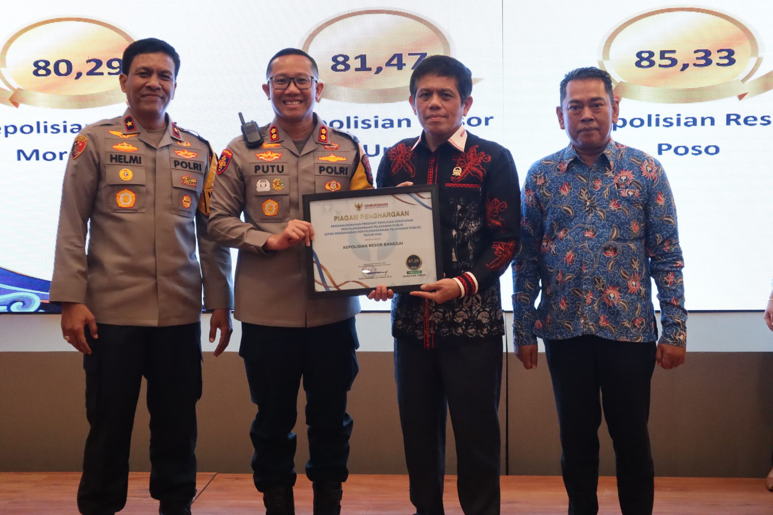 Globalrakyat.com – Ombudsman RI memberikan penghargaan kepada Polres Banggai, atas predikat kepatuhan penyelengaraan pelayanan public tahun 2024 dengan kualitas tinggi nilai 87,20 atau zona hijau.