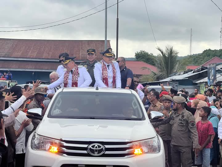 Dengan menggunakan pakaian dinas Bupati dan Wakil Bupati di sambut adat Cakalele.