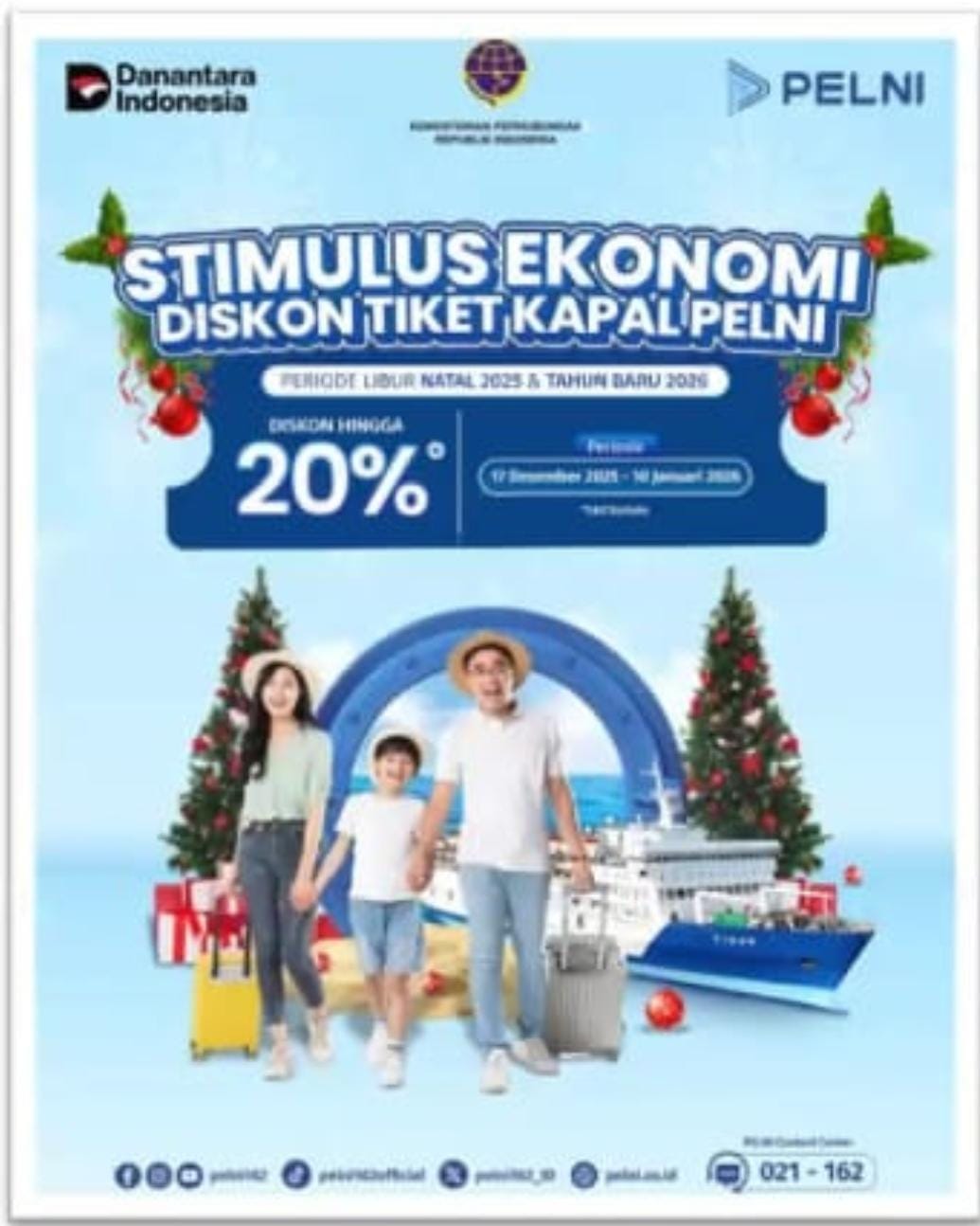 PT Pelayaran Nasional Indonesia atau PT PELNI (Persero) menerima penugasan dari program stimulus ekonomi berupa diskon tiket untuk kapal penumpang kelas ekonomi. Sekretaris Perusahaan PELNI Evan Eryanto mengatakan, penjualan tiket dengan potongan diskon akan dimulai pada Jumat (21/11) untuk periode keberangkatan terhitung tanggal 17 Desember 2025 hingga 10 Januari 2026. “Berlaku untuk seluruh tujuan atau pelabuhan yang disinggahi kapal penumpang menggunakan kelas ekonomi,” ujar Evan.