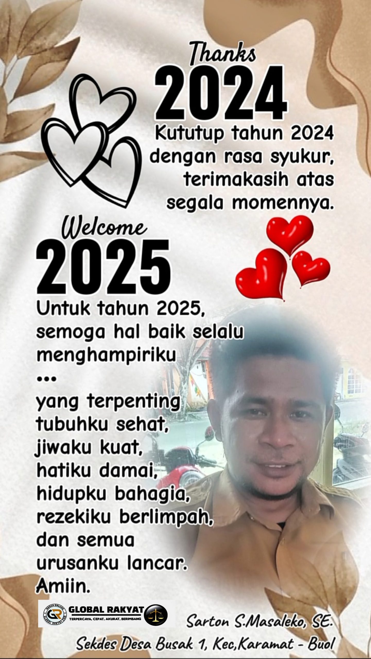 Sarton S.Masaleko, SE. Sekdes Desa Busak 1, Kecamatan Karamat, Kabupaten Buol Mengucapkan Selamat Tahun Baru 2025 Admin Global RakyatDecember 30, 202466 Views {"data":{"pictureId":"9b1377afa82c40c29882e91076e07c77","appversion":"4.5.0","stickerId":"","filterId":"","infoStickerId":"","imageEffectId":"","playId":"","activityName":"","os":"android","product":"lv","exportType":"image_export","editType":"image_edit","alias":""},"source_type":"vicut","tiktok_developers_3p_anchor_params":"{"source_type":"vicut","client_key":"aw889s25wozf8s7e","picture_template_id":"","capability_name":"retouch_edit_tool"}"} Post Views: 66 Baca Juga Berita Ini: Cek Kesiapan Pengamanan Natal 2024 Dan Tahun Baru 2025, Polres Buol Laksanakan Apel Gelar Pasukan Related postsDelapan Belas Tahun Berstatus Transmigrasi, Masyarakat Mengajukan Permohonan Penetapan Wilayah Sebagai Desa Definitif Kepada Pemerintah DaerahJelang Ramadhan dan Idul Fitri 1447 H, Polres Buol Gelar Apel Operasi Keselamatan Tinombala 2026Polres Buol Amankan Terduga Pelaku Penganiayaan Di LokodokaBerikan Dedikasi Tanpa Henti, Personel Polres Buol Terima Tanda Kehormatan Satyalancana PengabdianBPS Kabupaten Buol Gelar FGD Standar Pelayanan Publik Tahun 2026, Dorong Peningkatan Kualitas Layanan StatistikNelayan Buol Selamatkan 15 WNA Filipina Di Perairan Indonesia