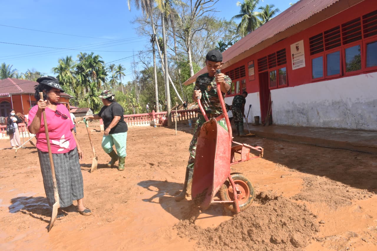 Kegiatan dilaksanakan secara gotong royong oleh personel Kodim 0211/Tapanuli Tengah bersama prajurit Yon TP 905/TS dan pihak sekolah dengan menggunakan peralatan manual seperti sekop, cangkul, dan angkong guna mempercepat proses pemulihan.