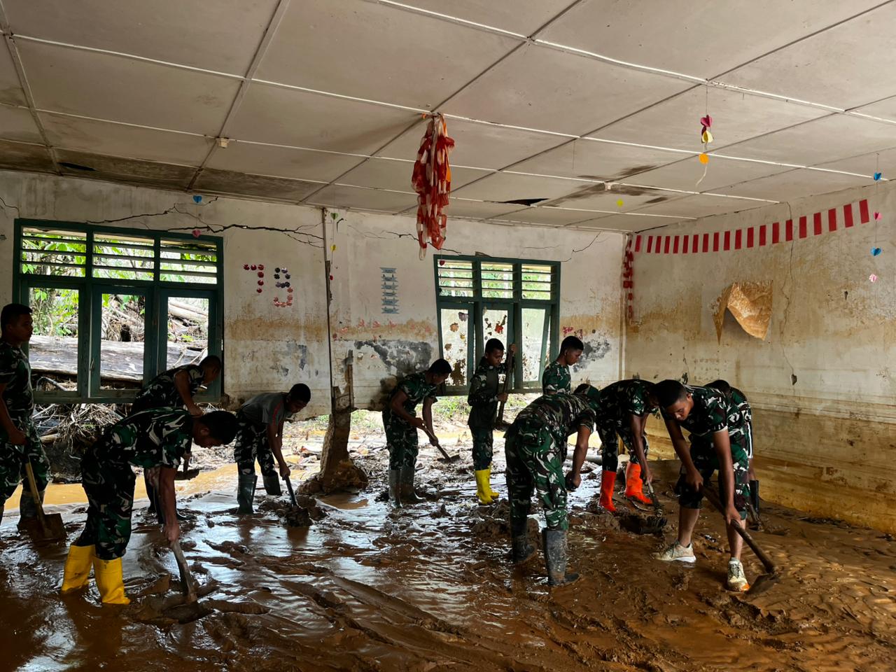 Pembersihan dilaksanakan secara gotong royong dengan melibatkan Babinsa Koramil 03/Pandan, personel Yon TP 905/TS, serta pihak sekolah yang dipimpin langsung oleh kepala sekolah. Sinergi tersebut menjadi wujud kepedulian bersama dalam mempercepat pemulihan sarana pendidikan pascabencana.