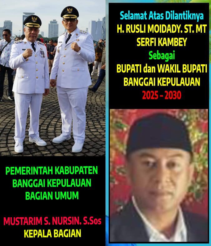 Selamat Dilantiknya Bupati Dan Wakil Bupati Banggai Kepulauan Admin Global RakyatFebruary 26, 202591 Views Post Views: 91 Baca Juga Berita Ini: Bupati Bangkep Bersama Forkopimda Lepas Pawai Takbiran Idul Adha Di Salakan Related postsSelamat Hari Raya Idul Fitri 1447 H/2026 MDinas Perumahan, Kawasan Pemukiman Dan Pertanahan Banggai Kepulauan Bagikan Takjil Gratis Jelang Berbuka PuasaSemangat Berbagi Di Bulan Ramadan, BPBD Banggai Kepulauan Bagikan Takjil untuk Warga Dan Pengguna JalanPeletakan Batu Pertama Oleh Bupati Banggai Kepulauan Pada Pembangunan Kampung Nelayan Merah Putih Di Desa KalumbatanSelamat Hari Raya Idul Fitri 1447 H/2026 MSelamat Hari Raya Idul Fitri 1447 H/2026 M