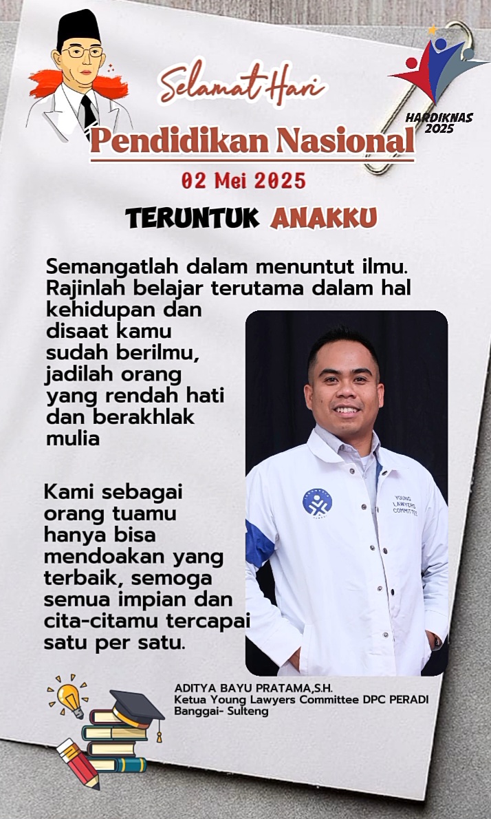 Selamat Hari Pendidikan Nasional 2 Mei 2025 Admin Global RakyatMay 2, 202568 Views Post Views: 68 Baca Juga Berita Ini: Polsek Batui Serahkan Tersangka Kekerasan Anak ke Kejaksaan Related postsAsik Pesta Sabu Di Kos, Dua Pria Asal Batui Selatan Diamankan Polres BanggaiPJS Tunjukkan Solidaritas, Beri Dukungan Kepada Anggota Yang BerdukaDirektur RSUD Luwuk Gelar Halal Bihalal, Pererat Silaturahmi Antar PegawaiPelayanan RSUD Luwuk Tetap Prima Di Tengah Libur LebaranPetugas KPPP Luwuk Sigap Evakuasi Penumpang Sakit Di Pelabuhan RakyatMasjid Nurul Yaqin Ramaikan Pawai Takbir PHBI Kabupaten Banggai