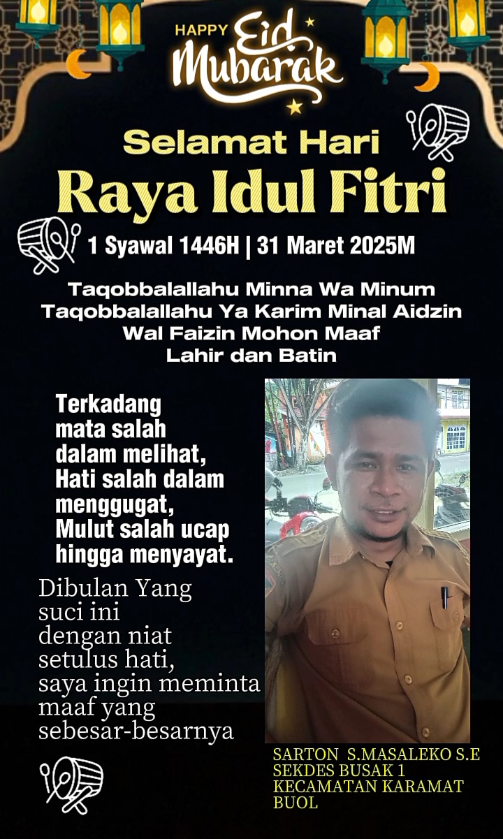 Selamat Hari Raya Idul fitri 1446 H/2025 M Admin Global RakyatMarch 30, 202585 Views Post Views: 85 Baca Juga Berita Ini: Perayaan Natal 2024 Di Buol Kondusif, Jemaat Ucapkan Terima Kasih Kepada Petugas Gabungan Related postsDelapan Belas Tahun Berstatus Transmigrasi, Masyarakat Mengajukan Permohonan Penetapan Wilayah Sebagai Desa Definitif Kepada Pemerintah DaerahJelang Ramadhan dan Idul Fitri 1447 H, Polres Buol Gelar Apel Operasi Keselamatan Tinombala 2026Polres Buol Amankan Terduga Pelaku Penganiayaan Di LokodokaBerikan Dedikasi Tanpa Henti, Personel Polres Buol Terima Tanda Kehormatan Satyalancana PengabdianBPS Kabupaten Buol Gelar FGD Standar Pelayanan Publik Tahun 2026, Dorong Peningkatan Kualitas Layanan StatistikNelayan Buol Selamatkan 15 WNA Filipina Di Perairan Indonesia