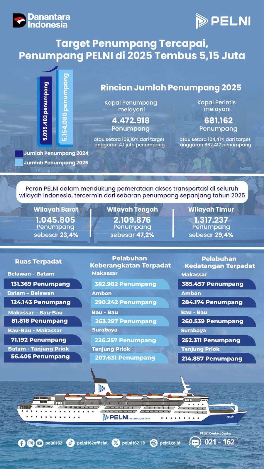 Nasional, Globalrakyat.com – Sepanjang tahun 2025, sebanyak 5.154.080 penumpang telah berlayar bersama kapal PELNI di seluruh rute Indonesia. Capaian ini melampaui realisasi tahun sebelumnya dan menunjukkan kepercayaan masyarakat yang terus meningkat terhadap layanan transportasi laut nasional.