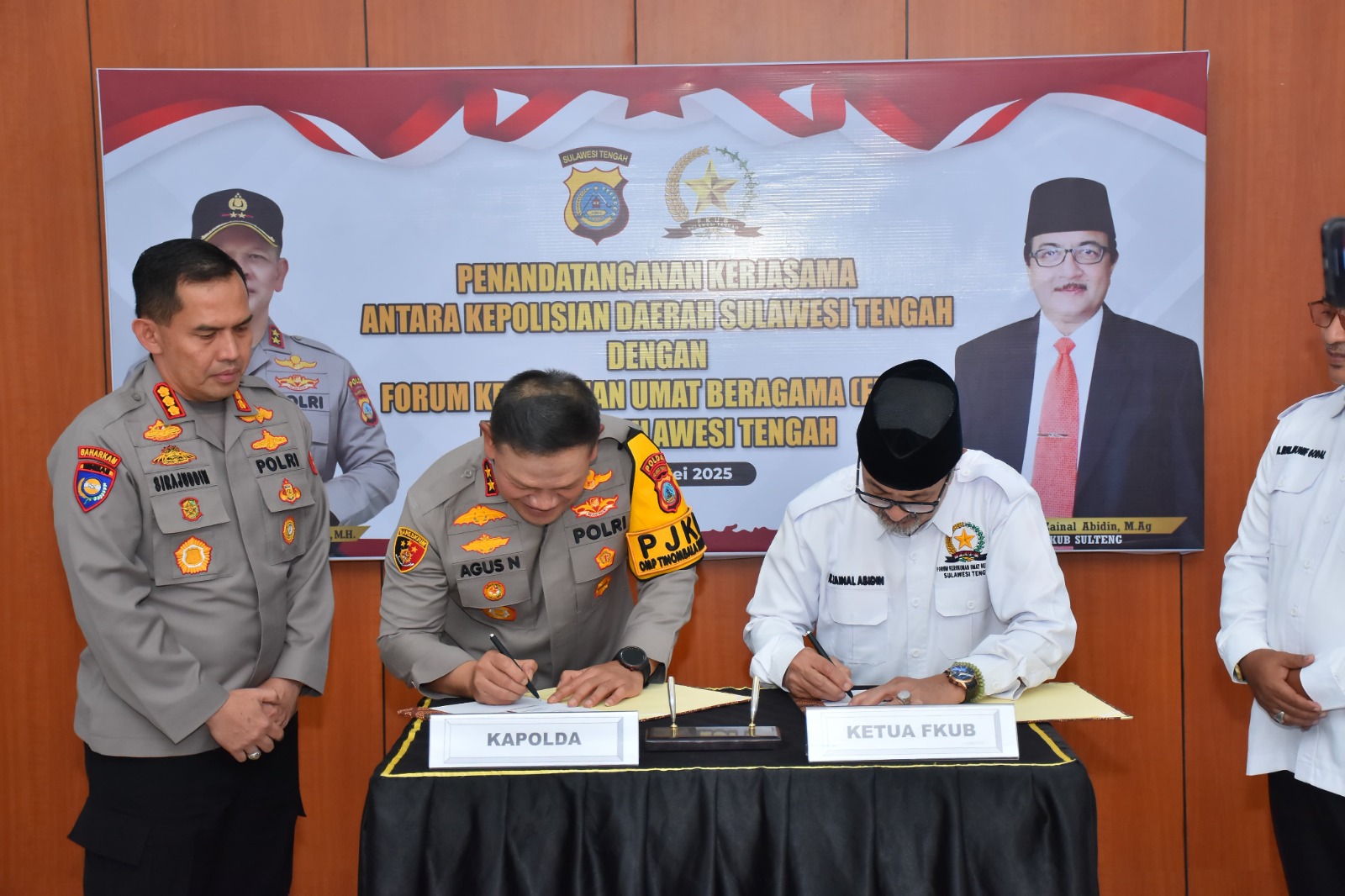 Penandatanganan nota kesepahaman dilakukan langsung Kapolda Sulteng Irjen Pol Dr. Agus Nogroho, S.I.K., SH., MH dan Ketua FKUB Sulteng Prof. Dr. H. Zainal Abidin, M.Ag di Ruang Rapat Kapolda Sulteng, Kamis (8/5/2025)