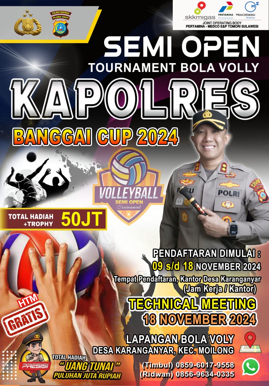 Dikatakan, Semi Open Tournament Kapolres Banggai Cup 2024 akan digelar di lapangan Voly Desa Karang Anyer Kecamatan Moilong.